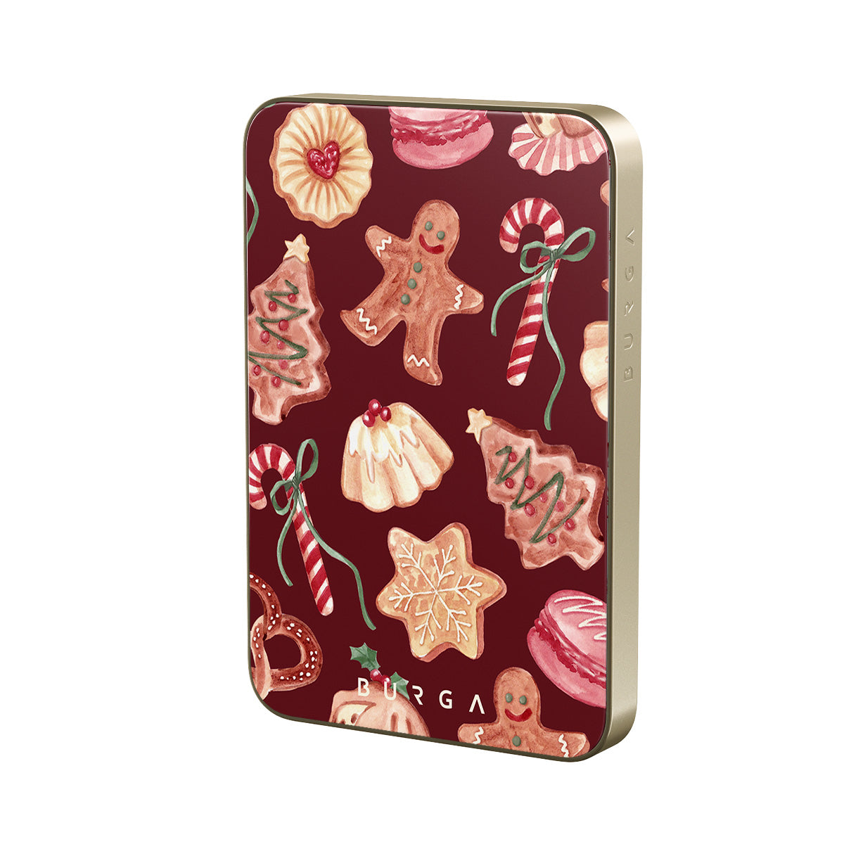 Este design contém: biscoitos de Natal, homens de gengibre, bengalas de doce, doces de hortelã, guloseimas festivas, fundo vermelho bordô