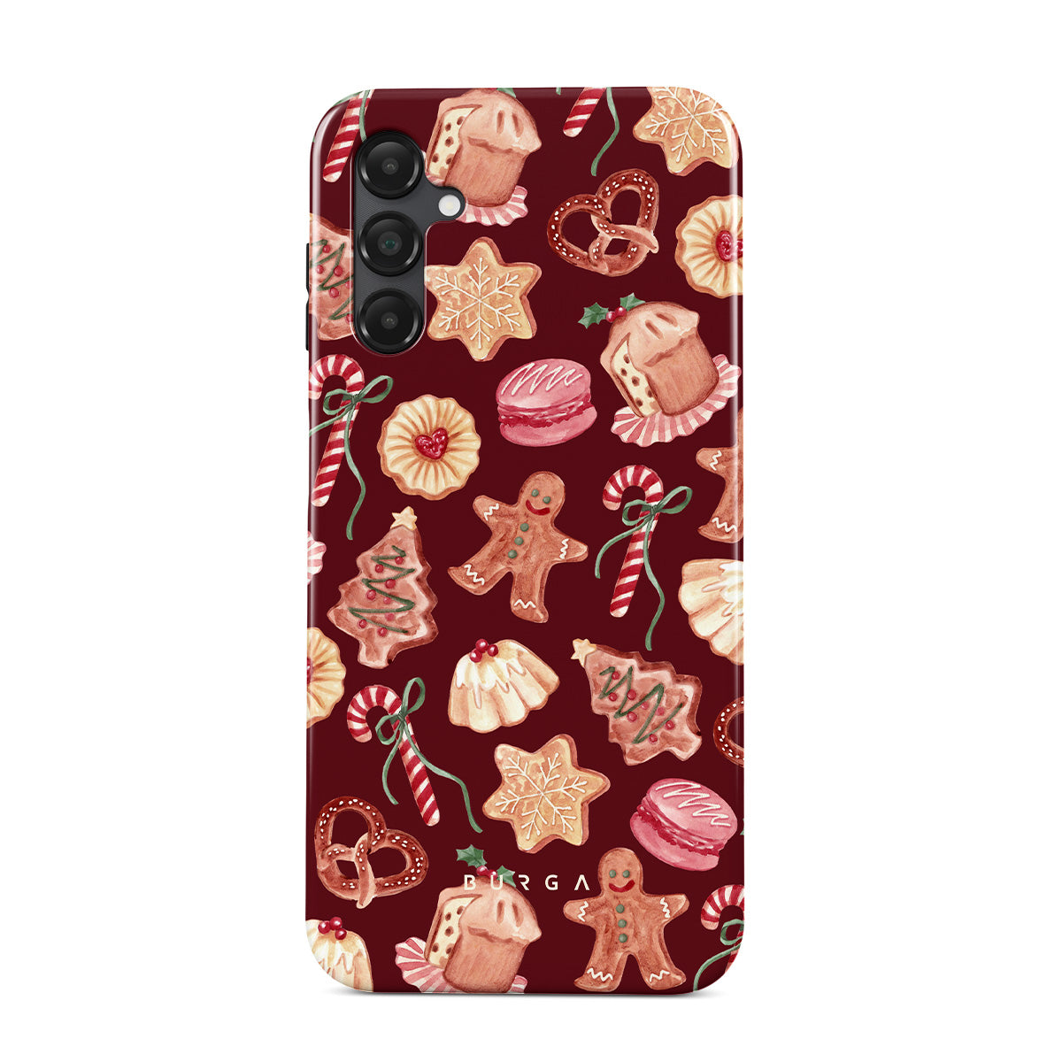 Este design contém: biscoitos de Natal, homens de gengibre, bengalas de doce, doces de hortelã, guloseimas festivas, fundo vermelho bordô