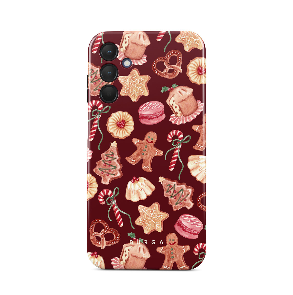 Este design contém: biscoitos de Natal, homens de gengibre, bengalas de doce, doces de hortelã, guloseimas festivas, fundo vermelho bordô
