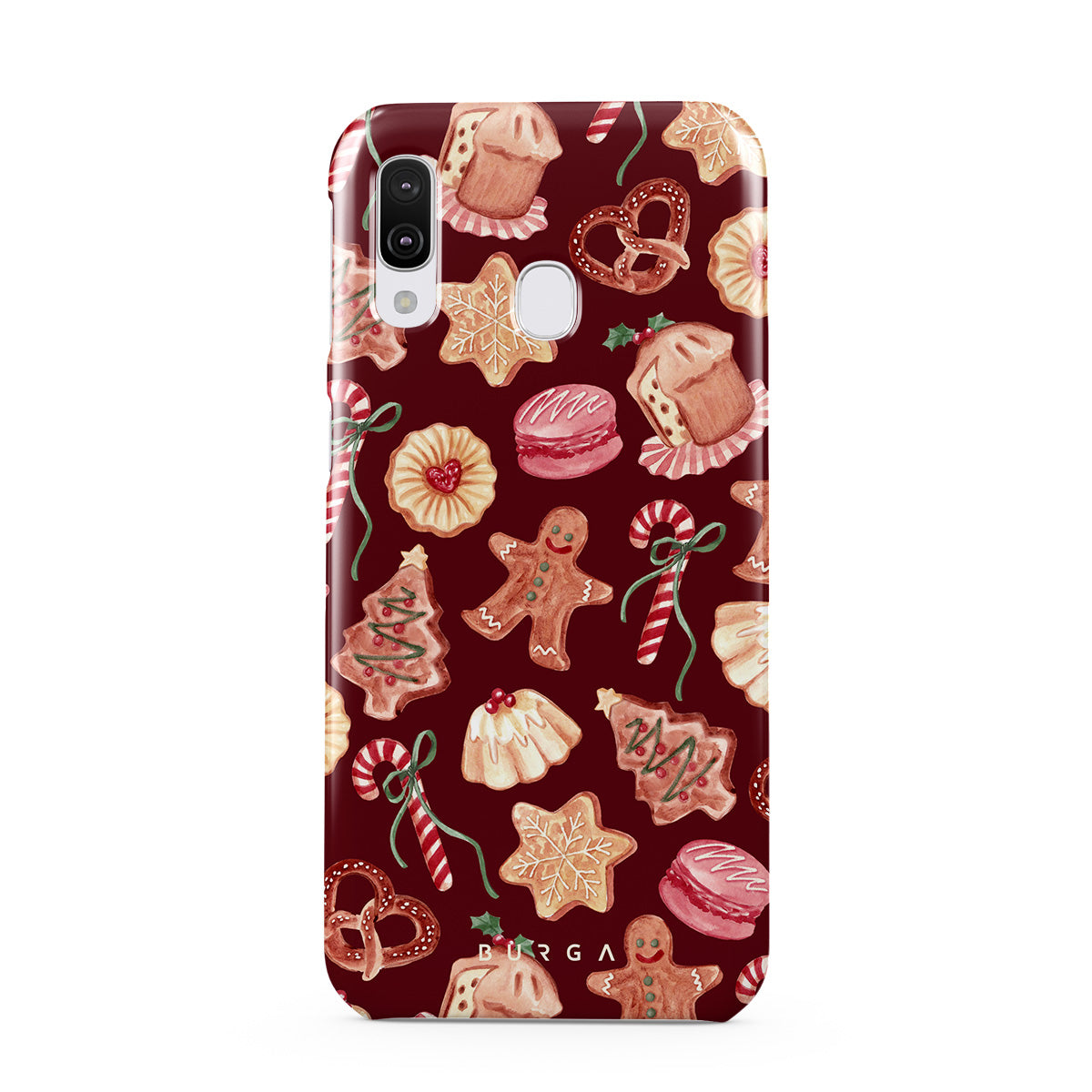 Este design contém: biscoitos de Natal, homens de gengibre, bengalas de doce, doces de hortelã, guloseimas festivas, fundo vermelho bordô