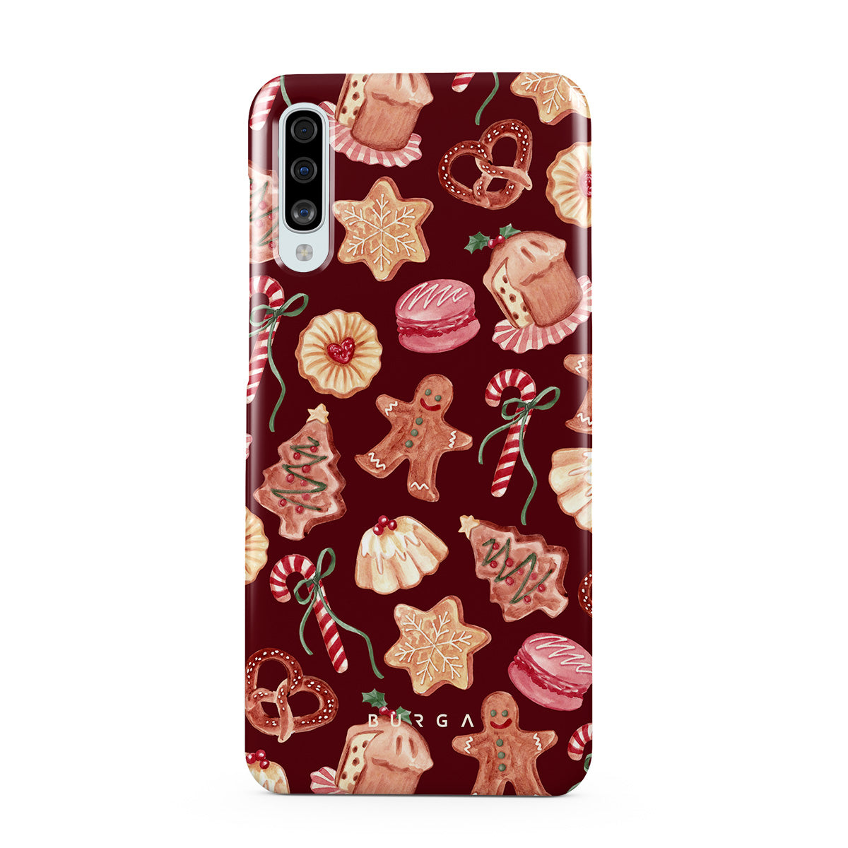 Este design contém: biscoitos de Natal, homens de gengibre, bengalas de doce, doces de hortelã, guloseimas festivas, fundo vermelho bordô