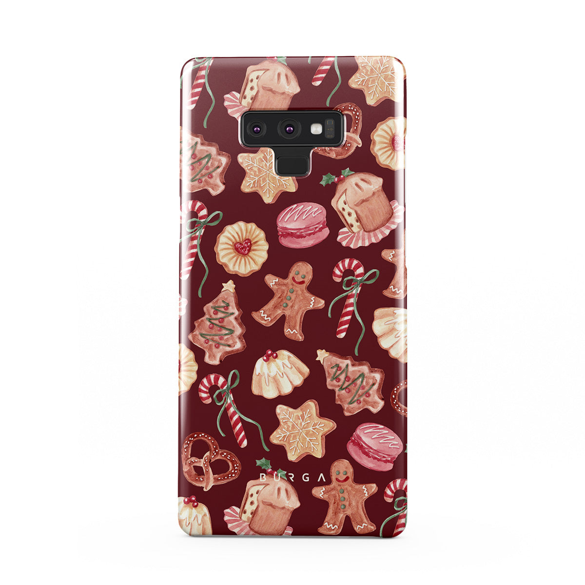 Este design contém: biscoitos de Natal, homens de gengibre, bengalas de doce, doces de hortelã, guloseimas festivas, fundo vermelho bordô