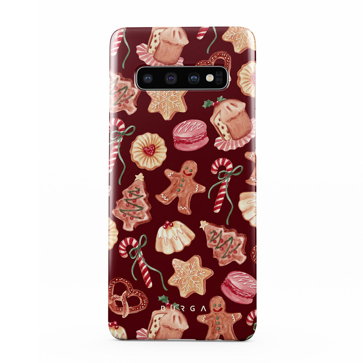 Este design contém: biscoitos de Natal, homens de gengibre, bengalas de doce, doces de hortelã, guloseimas festivas, fundo vermelho bordô