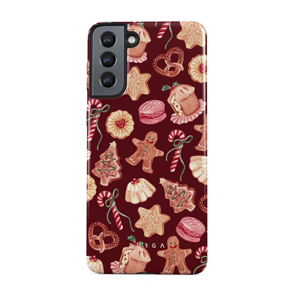 Este design contém: biscoitos de Natal, homens de gengibre, bengalas de doce, doces de hortelã, guloseimas festivas, fundo vermelho bordô