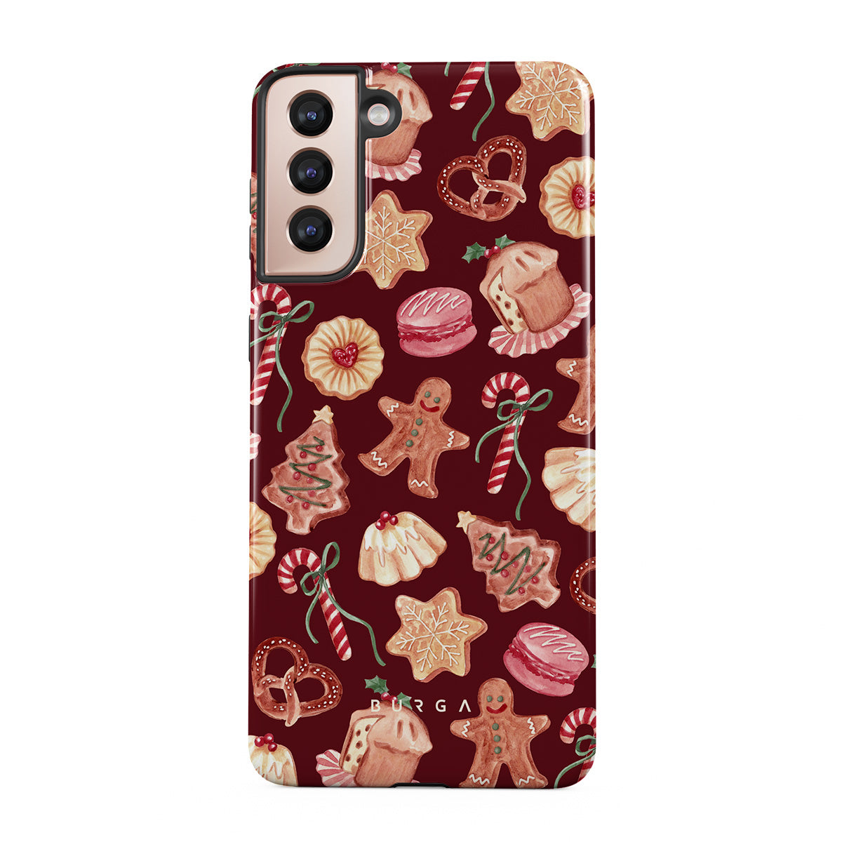 Este design contém: biscoitos de Natal, homens de gengibre, bengalas de doce, doces de hortelã, guloseimas festivas, fundo vermelho bordô