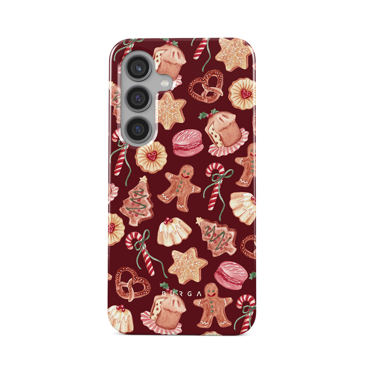 Este design contém: biscoitos de Natal, homens de gengibre, bengalas de doce, doces de hortelã, guloseimas festivas, fundo vermelho bordô