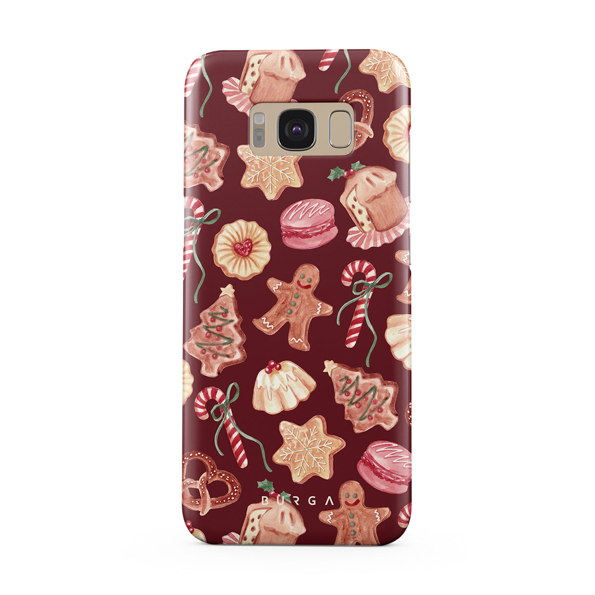 Este design contém: biscoitos de Natal, homens de gengibre, bengalas de doce, doces de hortelã, guloseimas festivas, fundo vermelho bordô