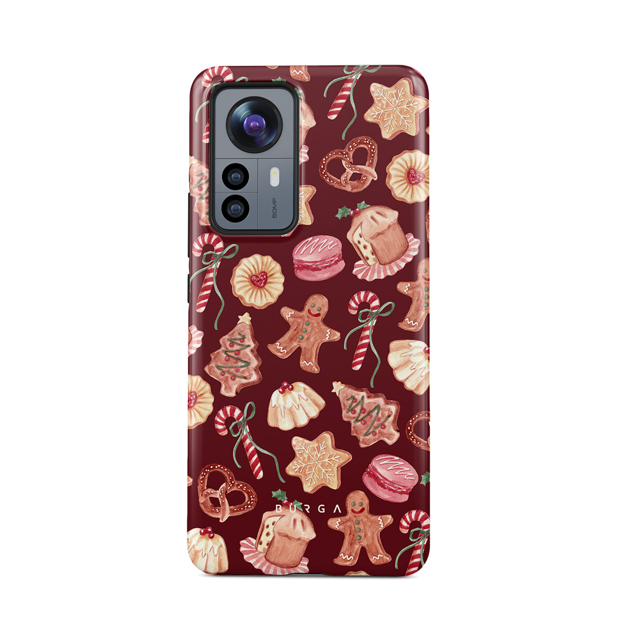 Este design contém: biscoitos de Natal, homens de gengibre, bengalas de doce, doces de hortelã, guloseimas festivas, fundo vermelho bordô