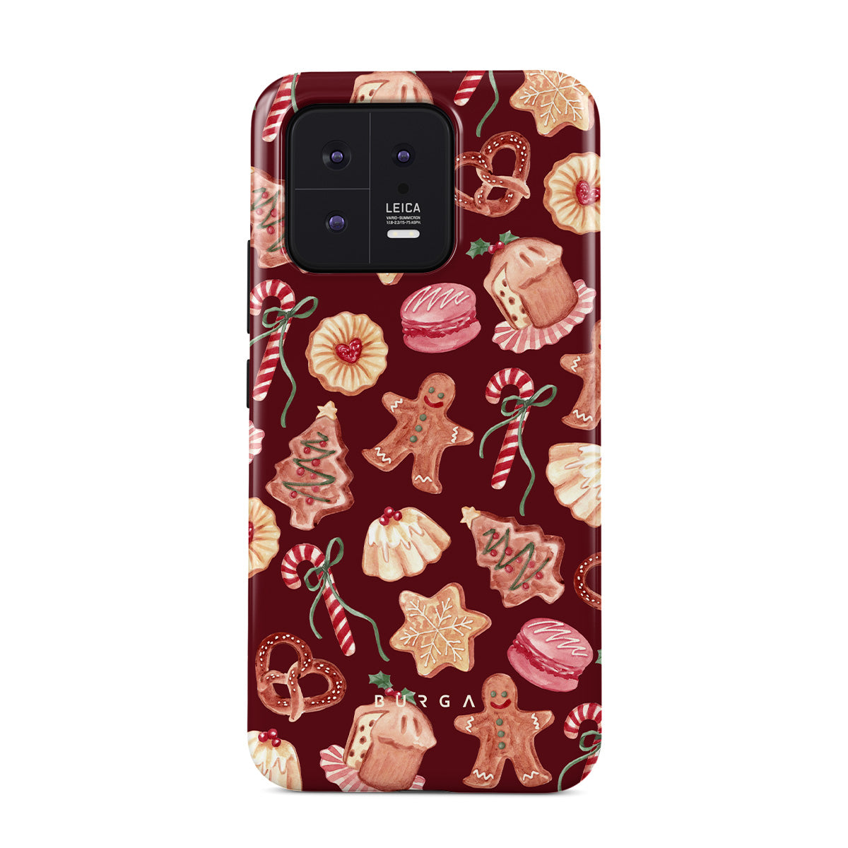 Este design contém: biscoitos de Natal, homens de gengibre, bengalas de doce, doces de hortelã, guloseimas festivas, fundo vermelho bordô