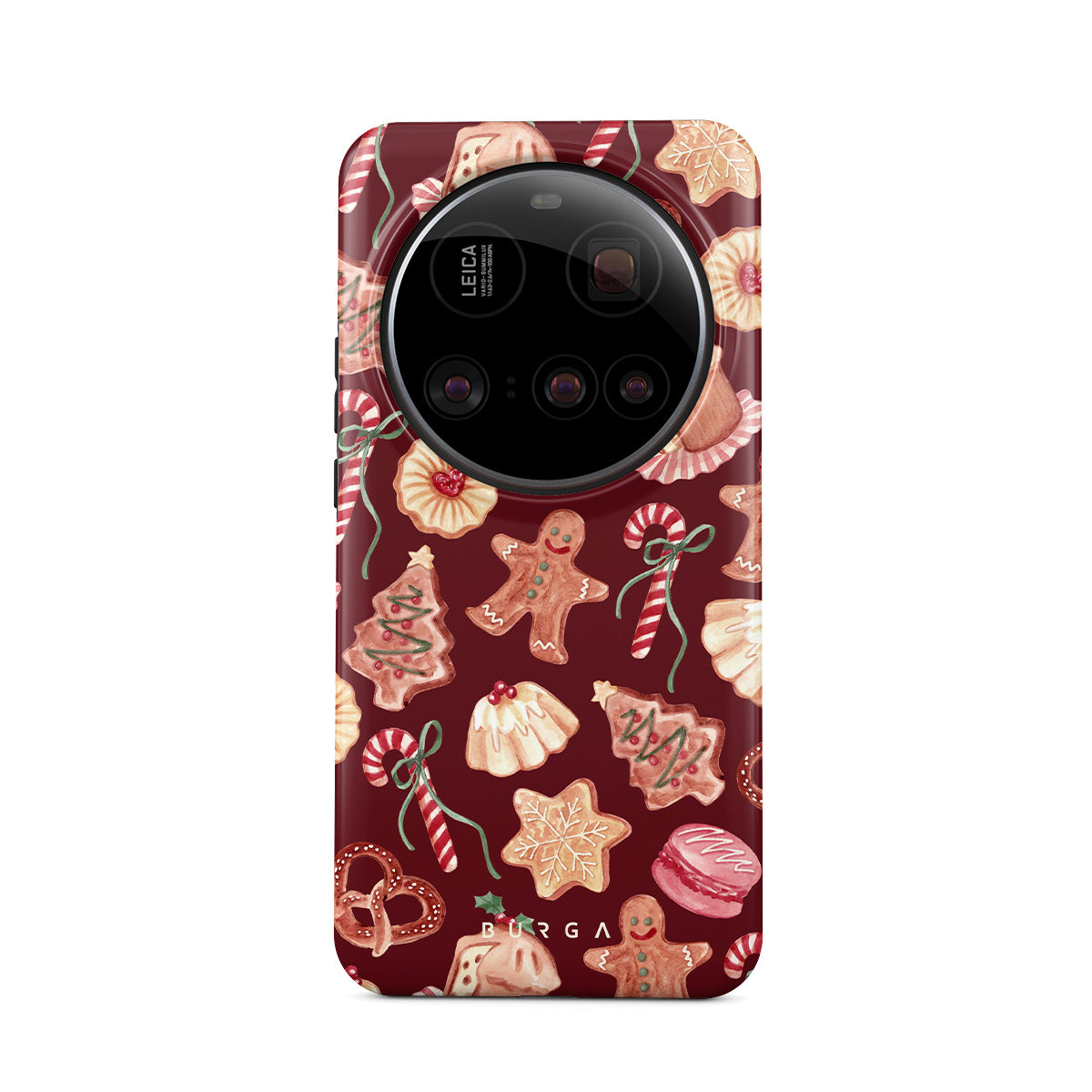 Este design contém: biscoitos de Natal, homens de gengibre, bengalas de doce, doces de hortelã, guloseimas festivas, fundo vermelho bordô