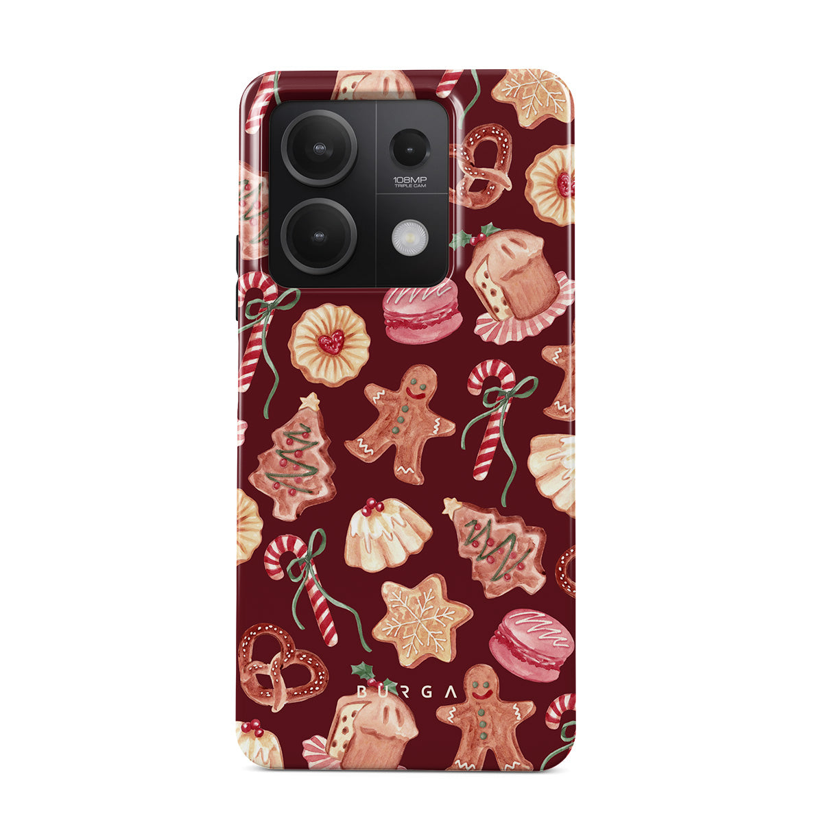 Este design contém: biscoitos de Natal, homens de gengibre, bengalas de doce, doces de hortelã, guloseimas festivas, fundo vermelho bordô