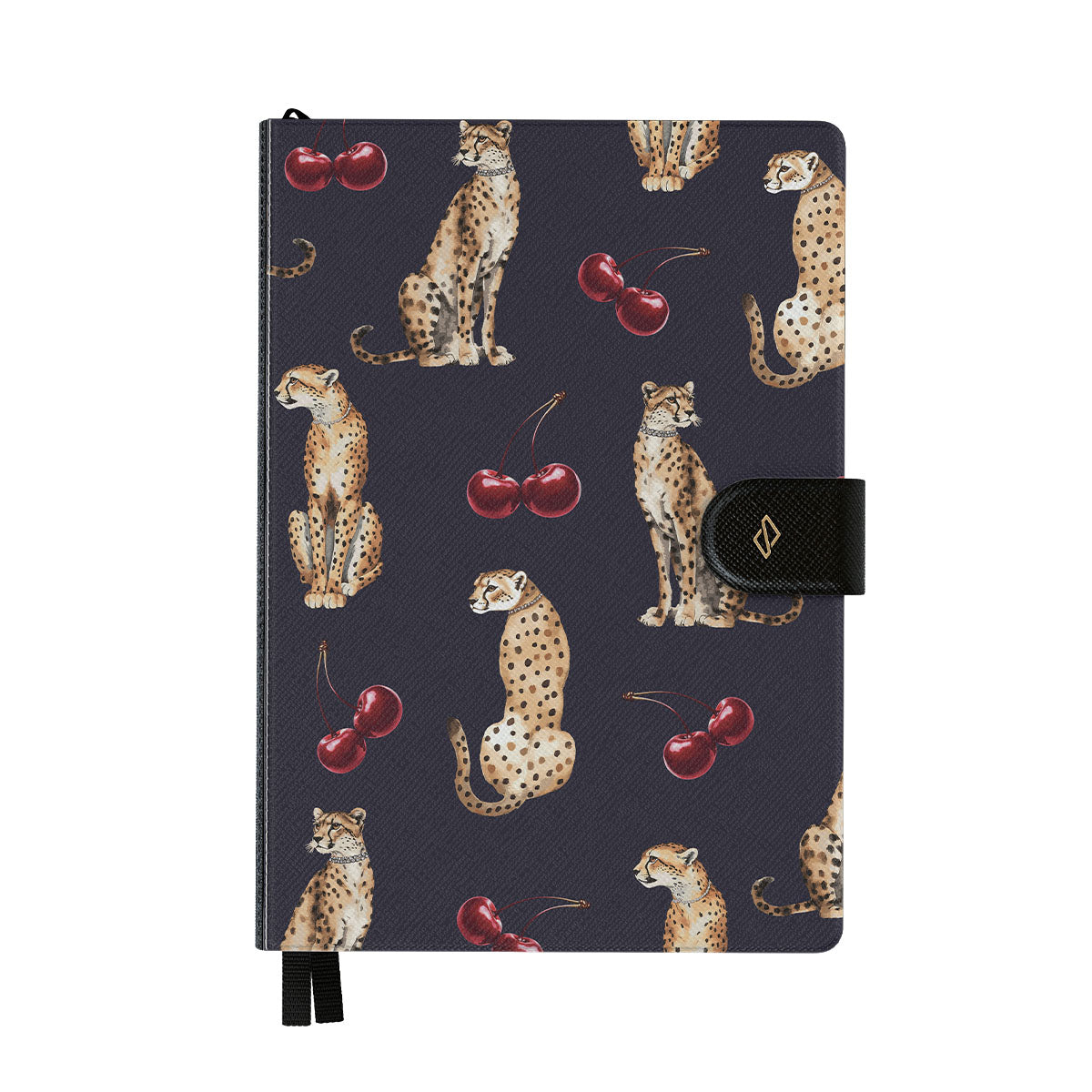 - Capa dura frontal em pele sintética vegana com desenhos únicos e elegantes;