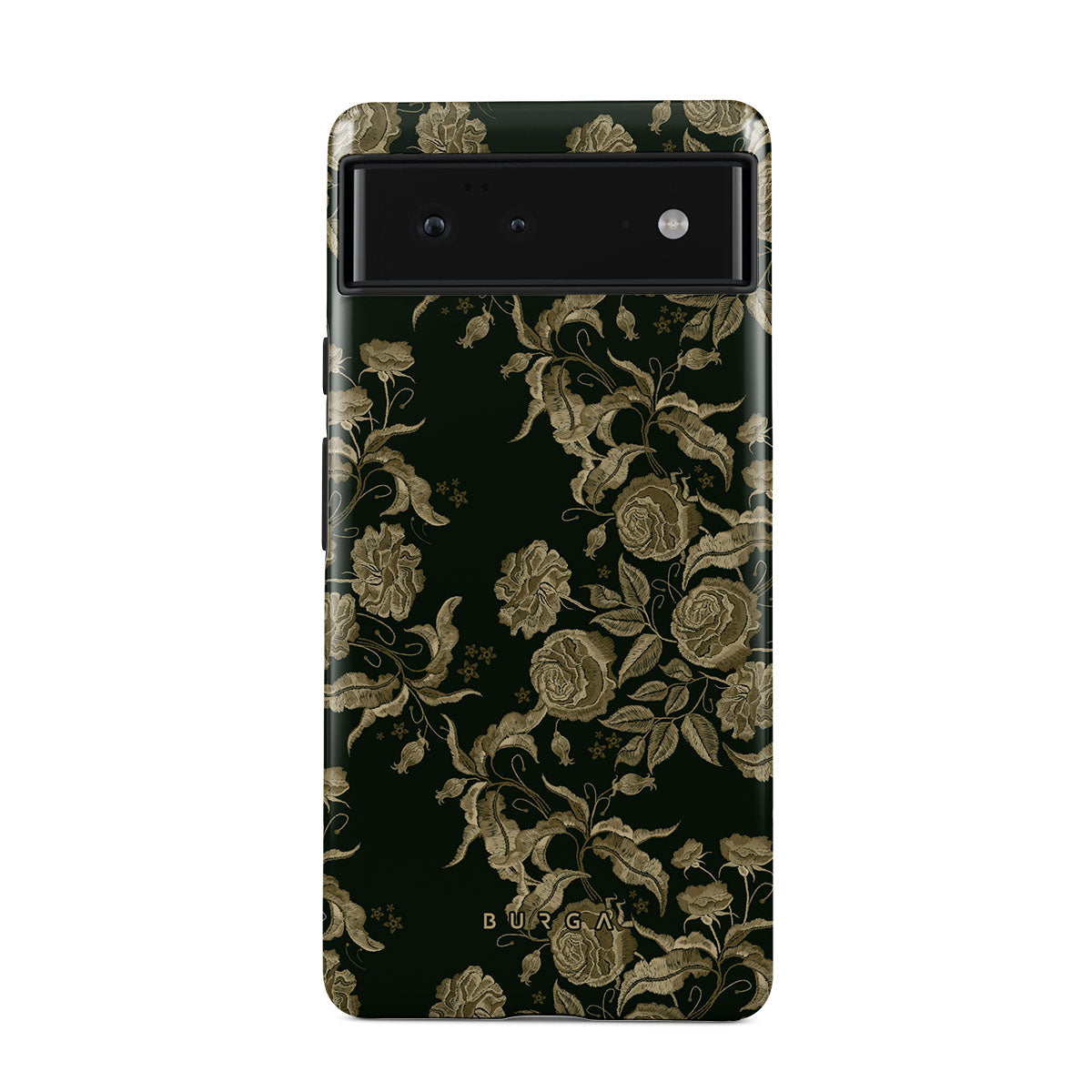 Este design contém: rosas vintage, folhagem dourada, tons verdes profundos.
