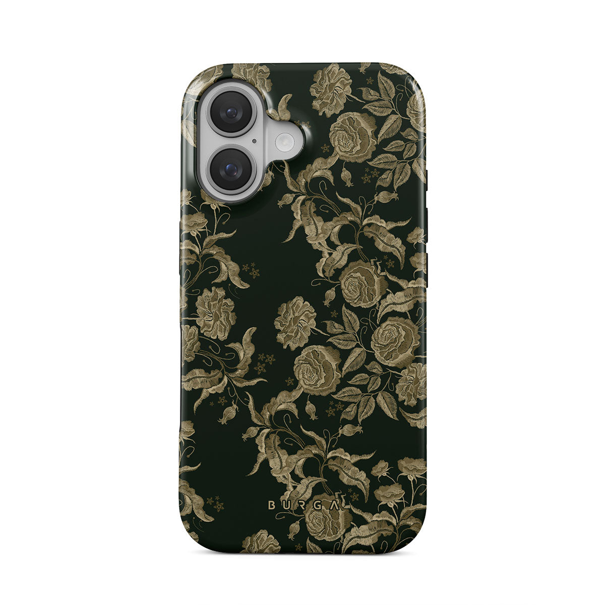 Este design contém: rosas vintage, folhagem dourada, tons verdes profundos.