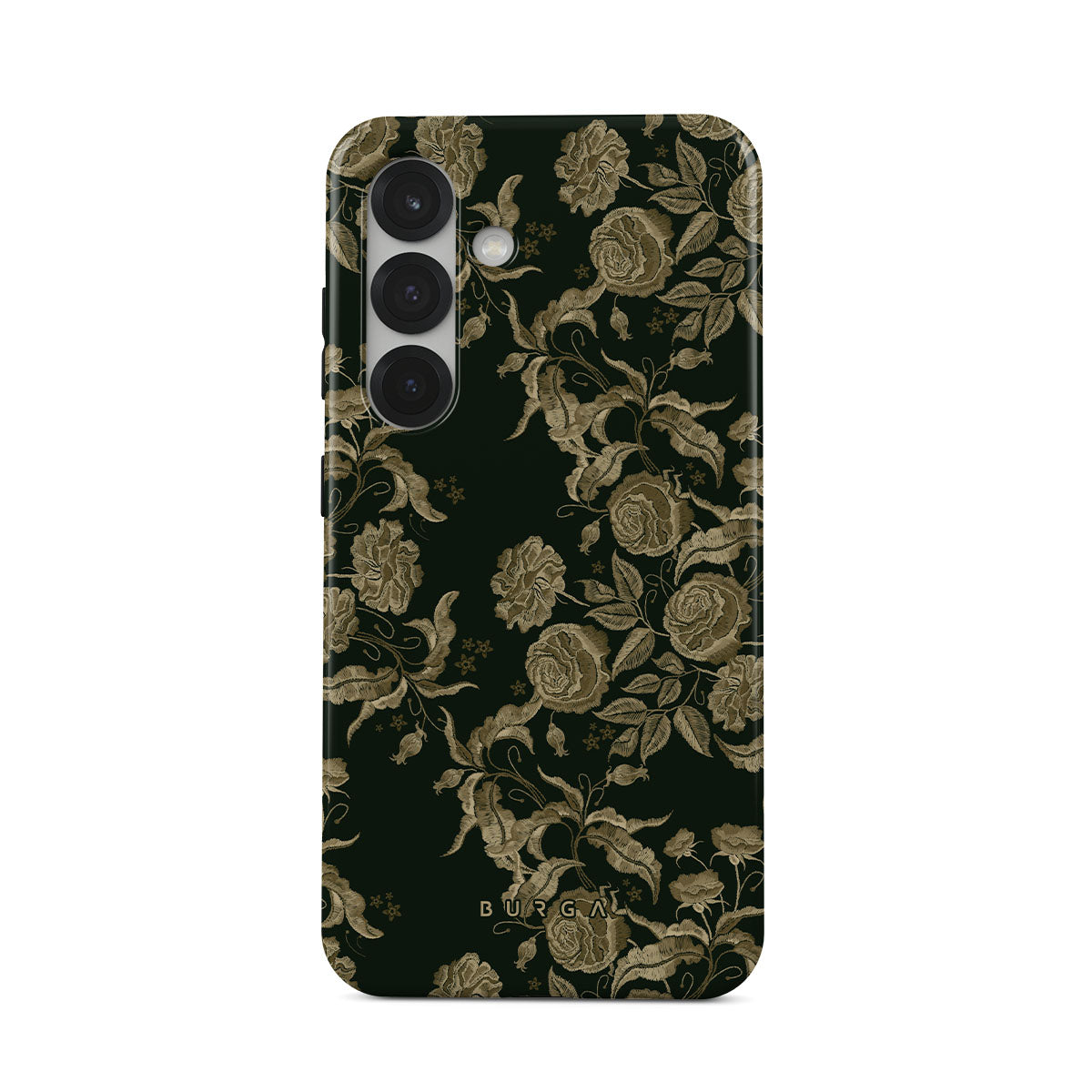 Este design contém: rosas vintage, folhagem dourada, tons verdes profundos.