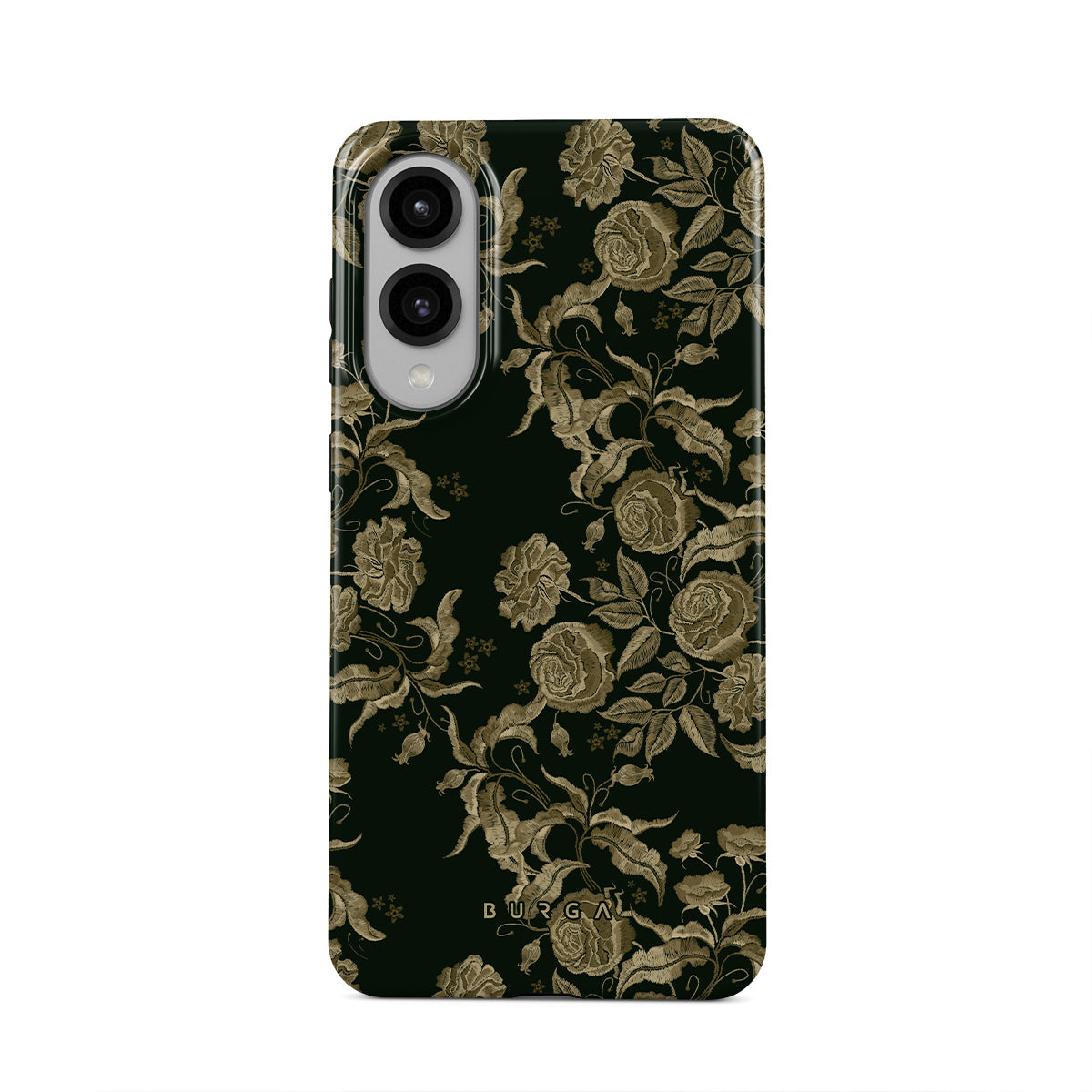Este design contém: rosas vintage, folhagem dourada, tons verdes profundos.