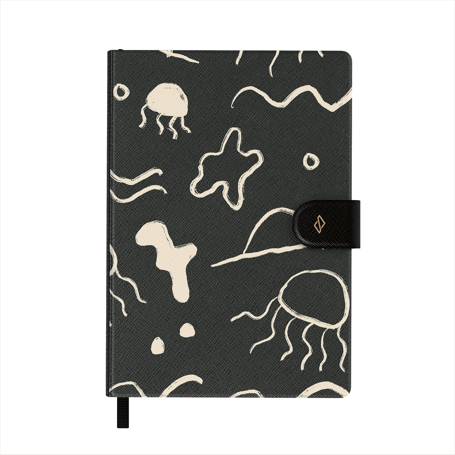 Apresenta padrões BURGA bem detalhados numa capa em pele sintética vegana, com um elegante marcador de páginas em fita preta.
