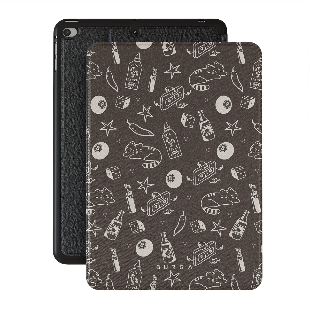 Este design contém: fundo castanho, rabiscos divertidos, gatos, estrelas, pimenta, dados, bola de bilhar, mix tape