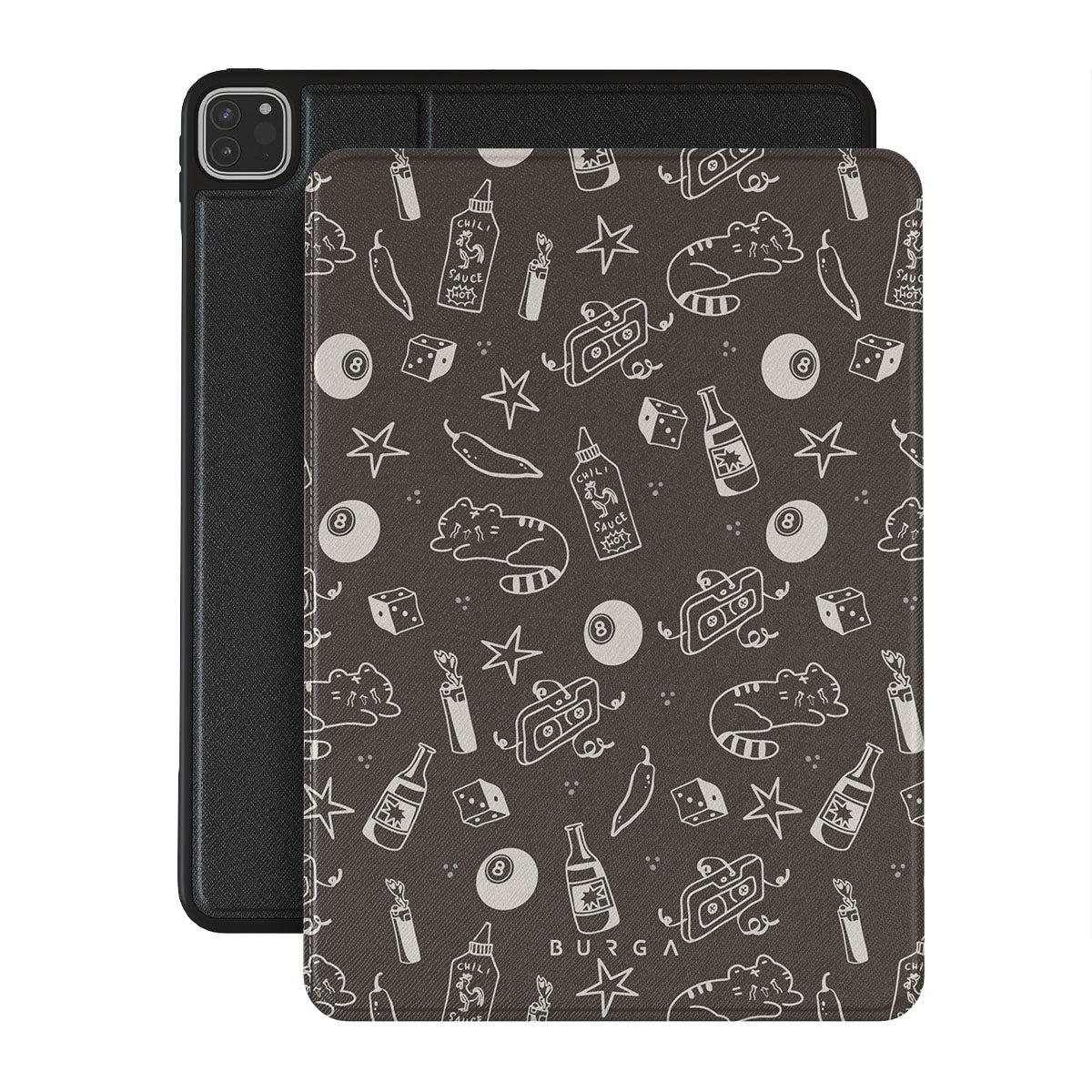 Este design contém: fundo castanho, rabiscos divertidos, gatos, estrelas, pimenta, dados, bola de bilhar, mix tape