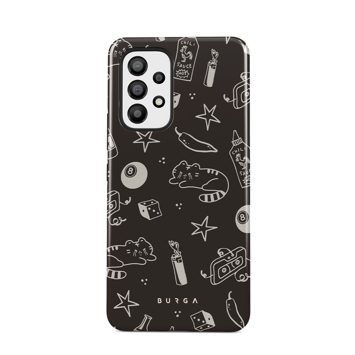 Este design contém: fundo castanho, rabiscos divertidos, gatos, estrelas, pimenta, dados, bola de bilhar, mix tape
