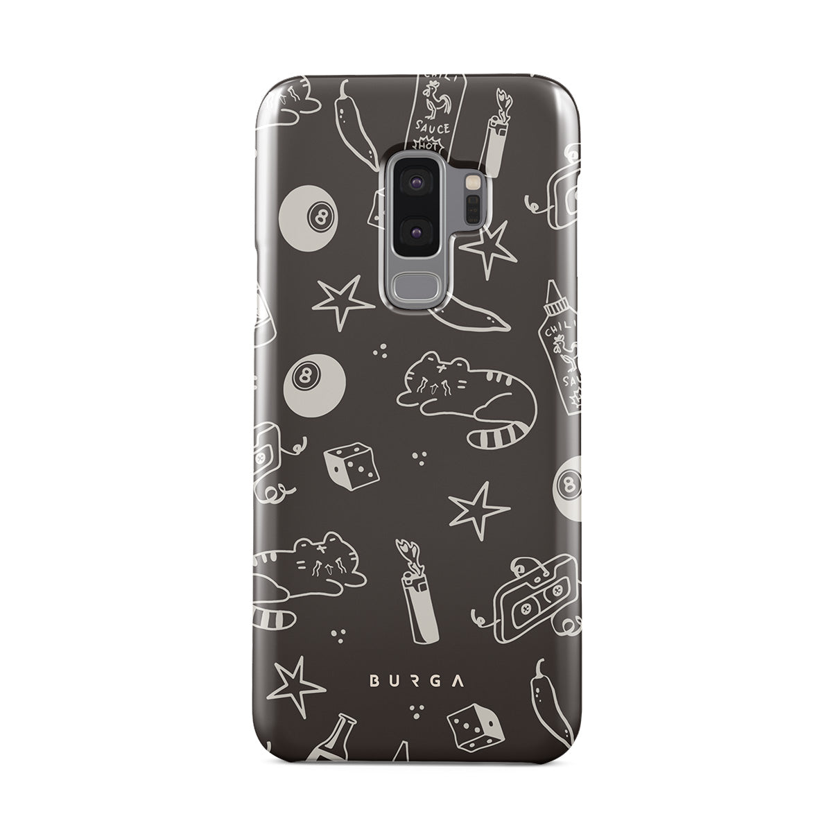 Este design contém: fundo castanho, rabiscos divertidos, gatos, estrelas, pimenta, dados, bola de bilhar, mix tape