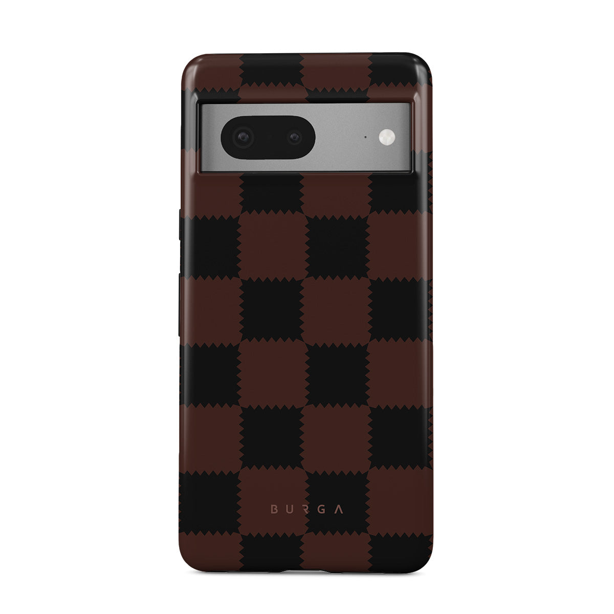 Este design contém: padrão xadrez, tons castanhos e escuros, geométrico