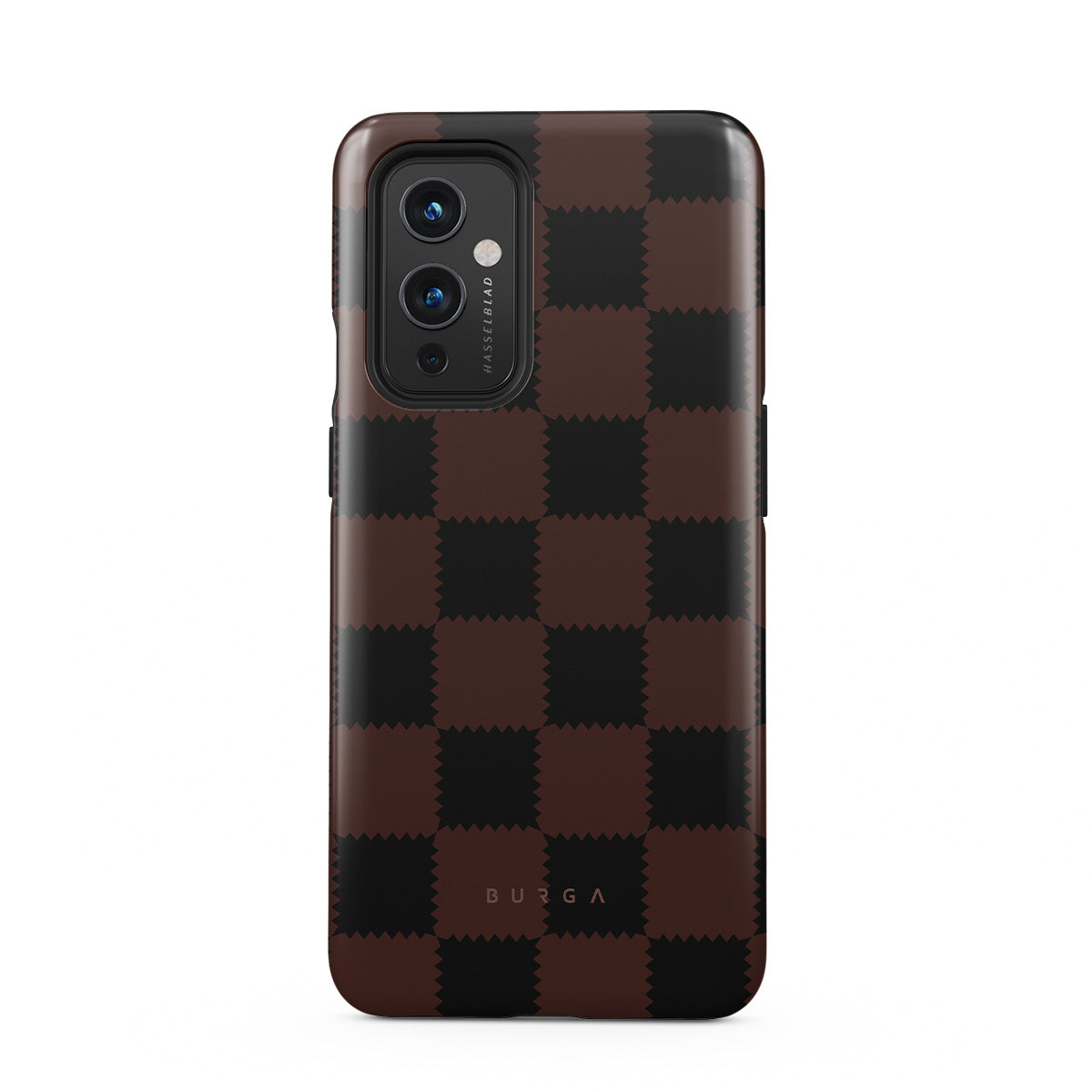 Este design contém: padrão xadrez, tons castanhos e escuros, geométrico