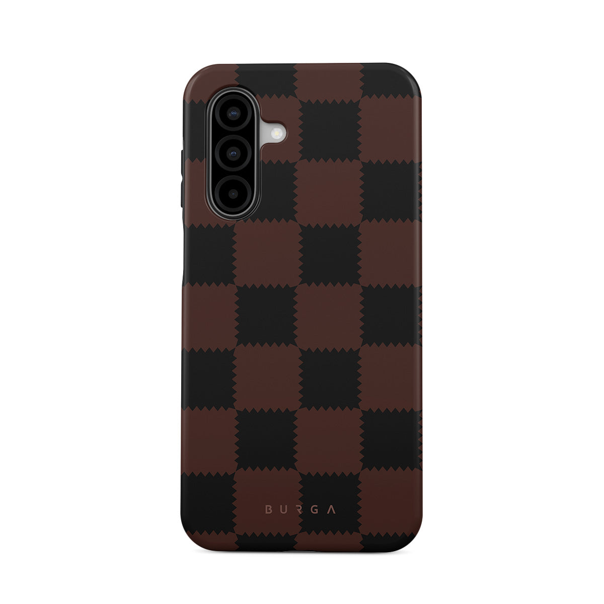 Este design contém: padrão xadrez, tons castanhos e escuros, geométrico
