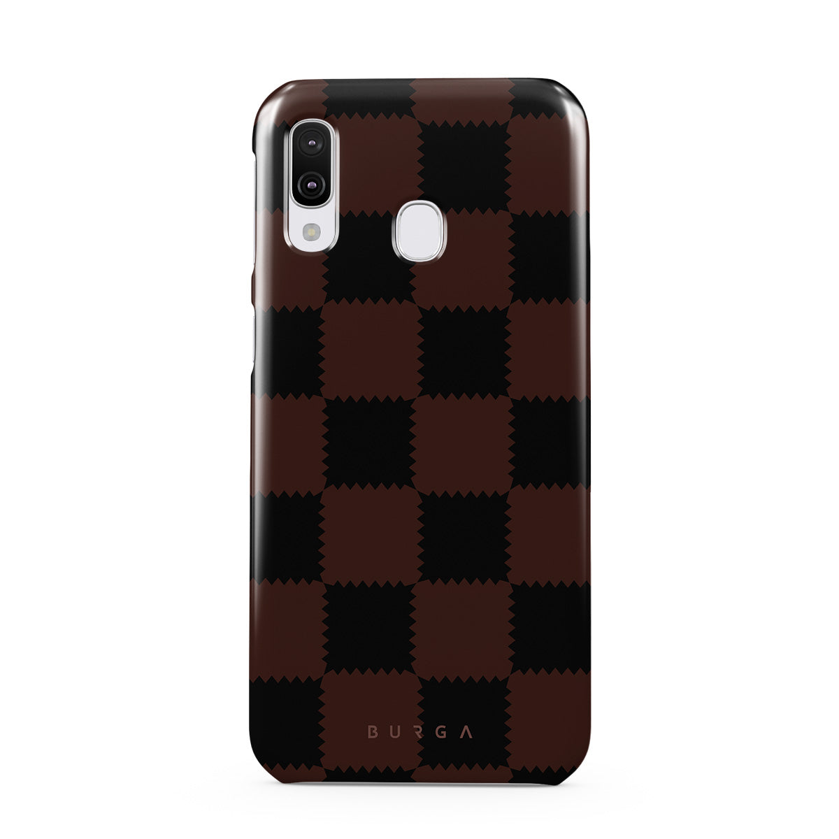 Este design contém: padrão xadrez, tons castanhos e escuros, geométrico