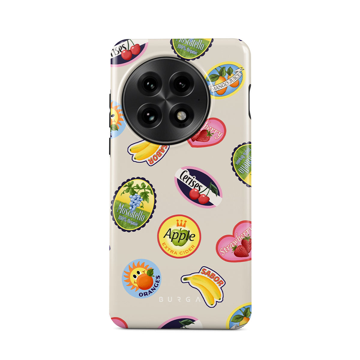 Este design contém:Bananas, selos, cerejas, maçãs, laranjas, morangos, cores vibrantes, acentos cítricos, motivos de frutas, padrões tropicais.