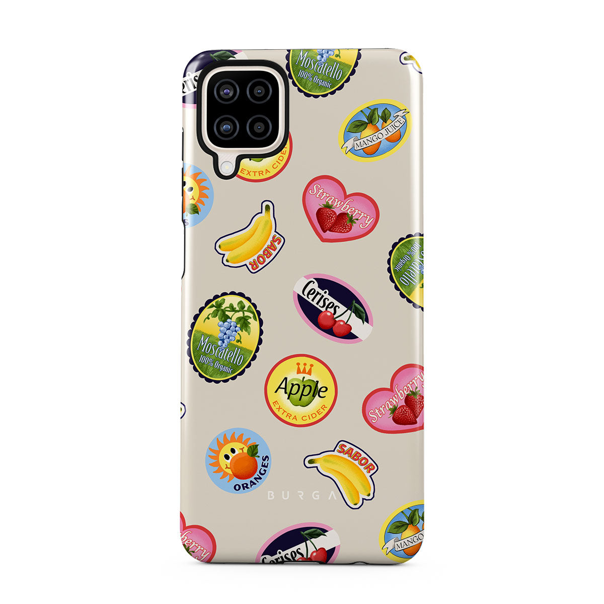 Este design contém:Bananas, selos, cerejas, maçãs, laranjas, morangos, cores vibrantes, acentos cítricos, motivos de frutas, padrões tropicais.