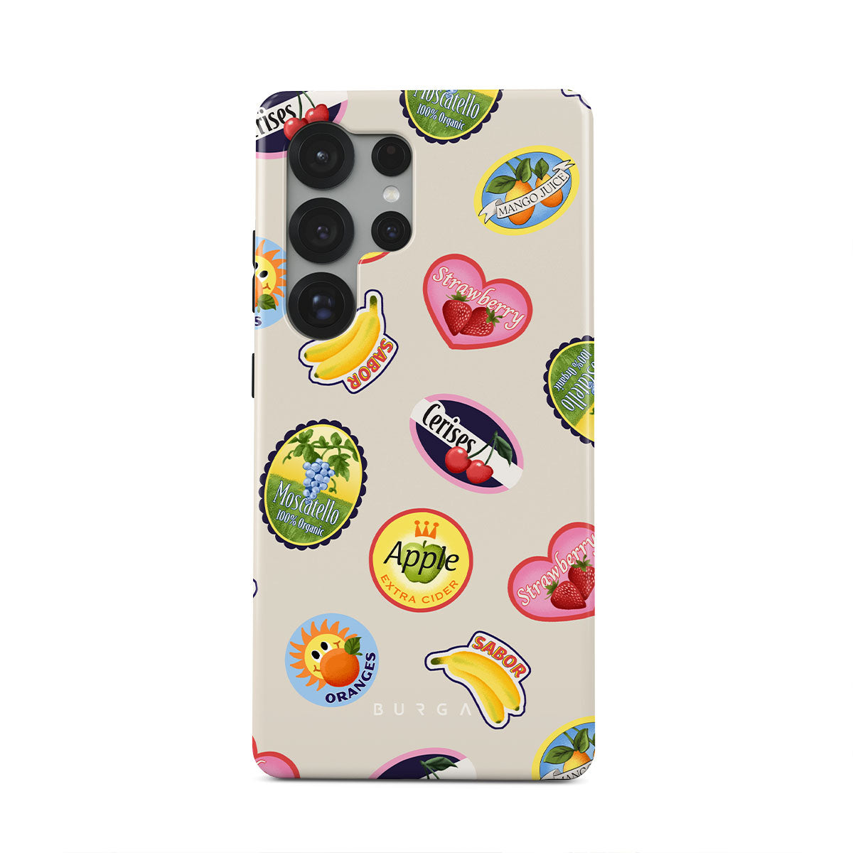 Este design contém:Bananas, selos, cerejas, maçãs, laranjas, morangos, cores vibrantes, acentos cítricos, motivos de frutas, padrões tropicais.
