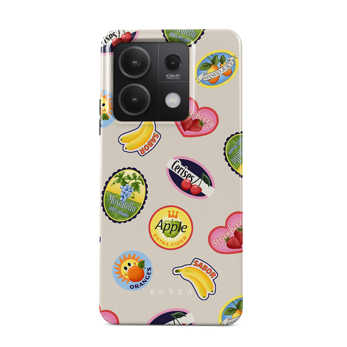 Este design contém:Bananas, selos, cerejas, maçãs, laranjas, morangos, cores vibrantes, acentos cítricos, motivos de frutas, padrões tropicais.