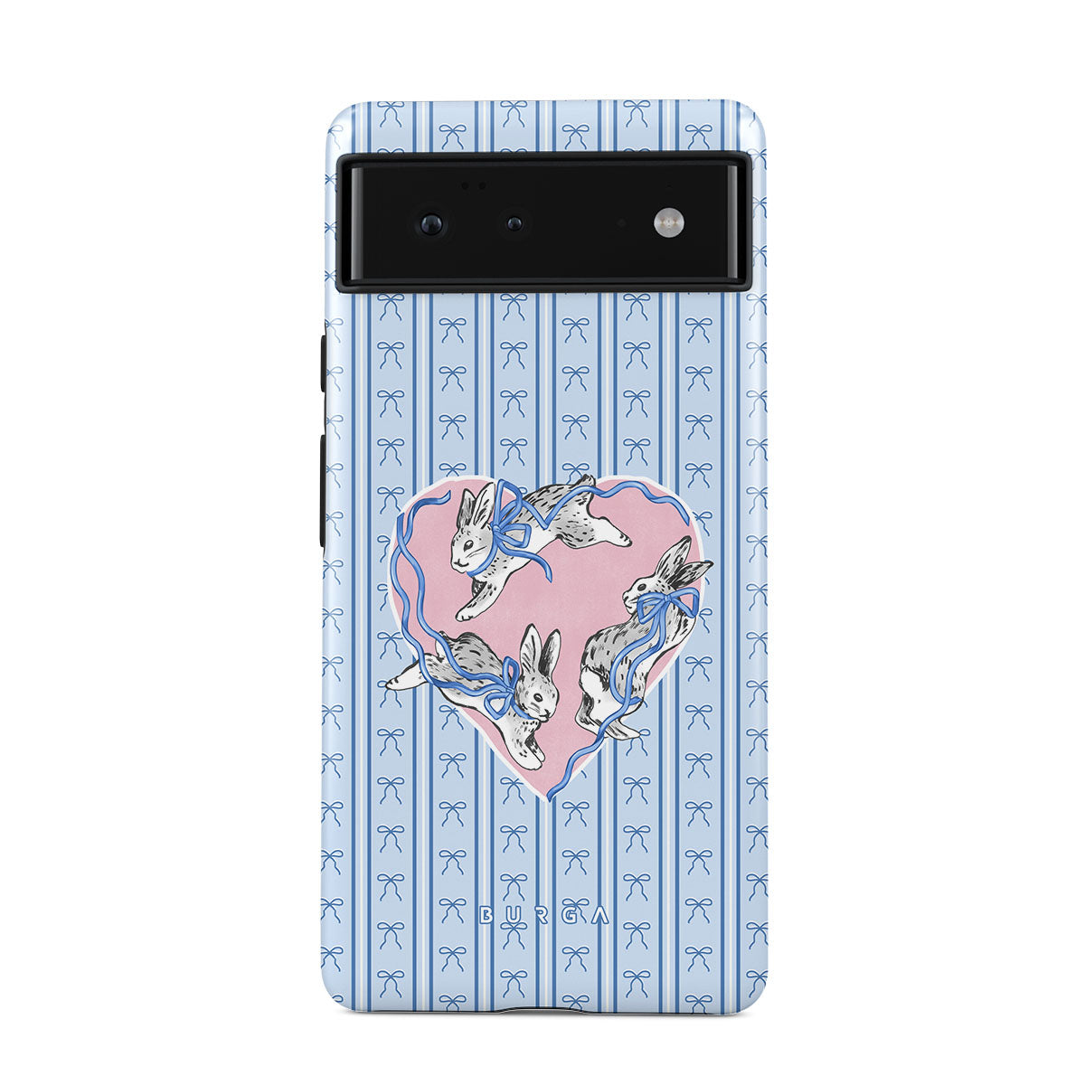 Este design contém: coelhos brancos, moldura de coração, riscas azuis