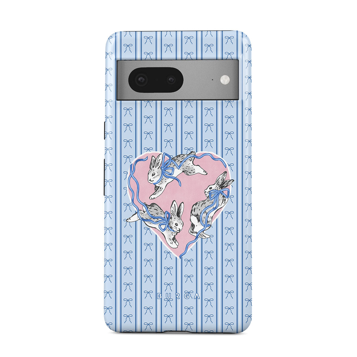Este design contém: coelhos brancos, moldura de coração, riscas azuis