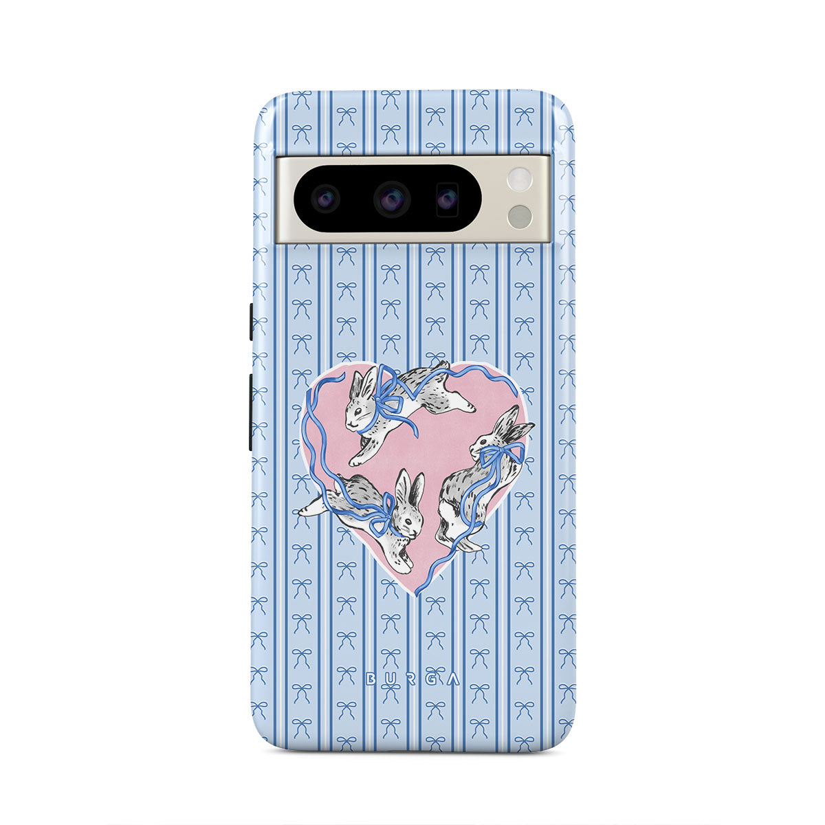 Este design contém: coelhos brancos, moldura de coração, riscas azuis