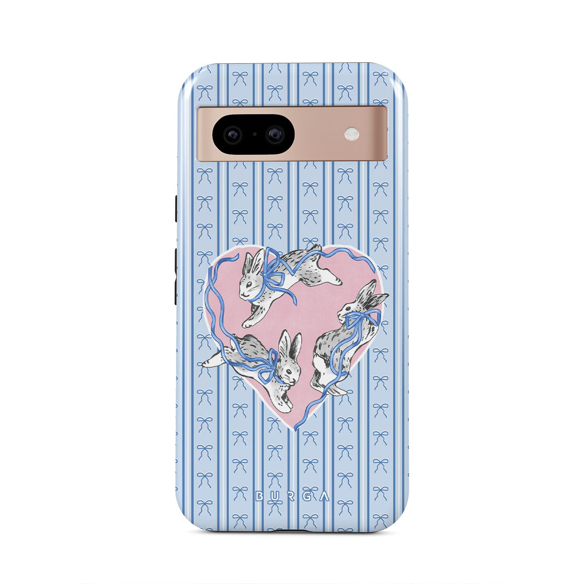 Este design contém: coelhos brancos, moldura de coração, riscas azuis