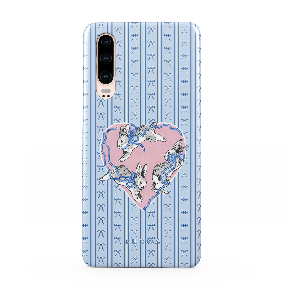 Este design contém: coelhos brancos, moldura de coração, riscas azuis
