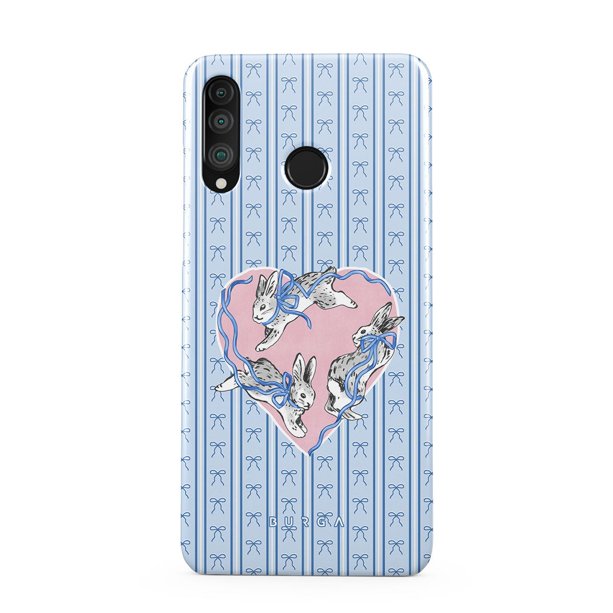 Este design contém: coelhos brancos, moldura de coração, riscas azuis