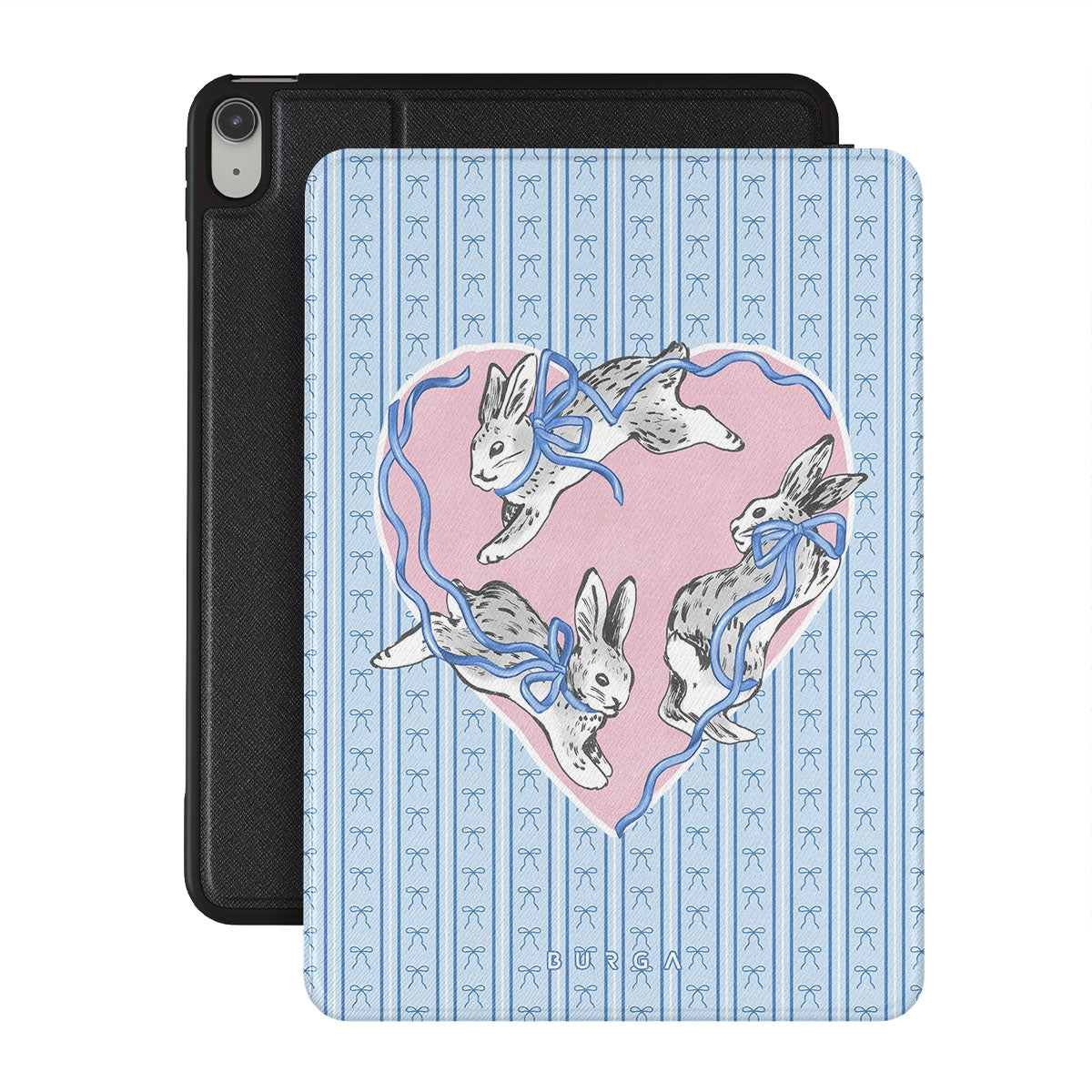 Este design contém: coelhos brancos, moldura de coração, riscas azuis