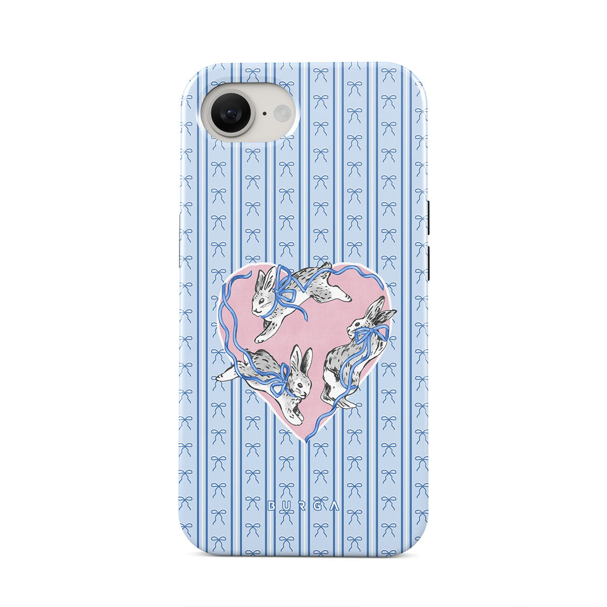 Este design contém: coelhos brancos, moldura de coração, riscas azuis