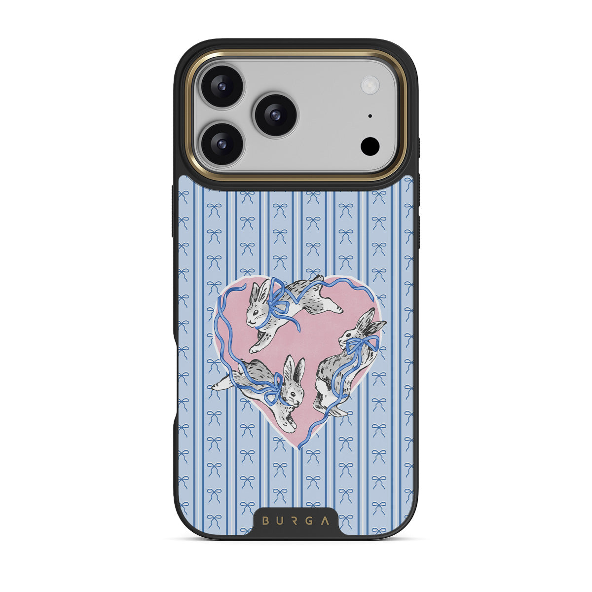 Este design contém: coelhos brancos, moldura de coração, riscas azuis