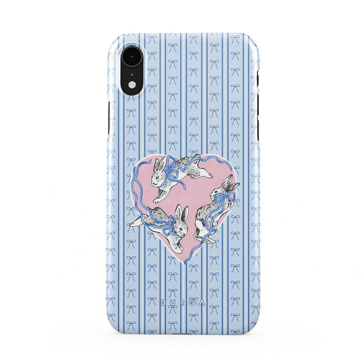 Este design contém: coelhos brancos, moldura de coração, riscas azuis