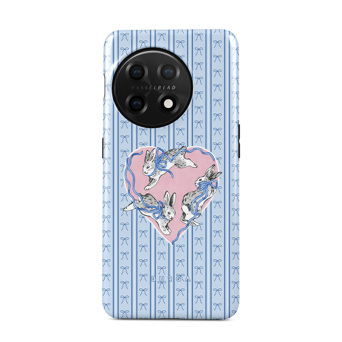 Este design contém: coelhos brancos, moldura de coração, riscas azuis