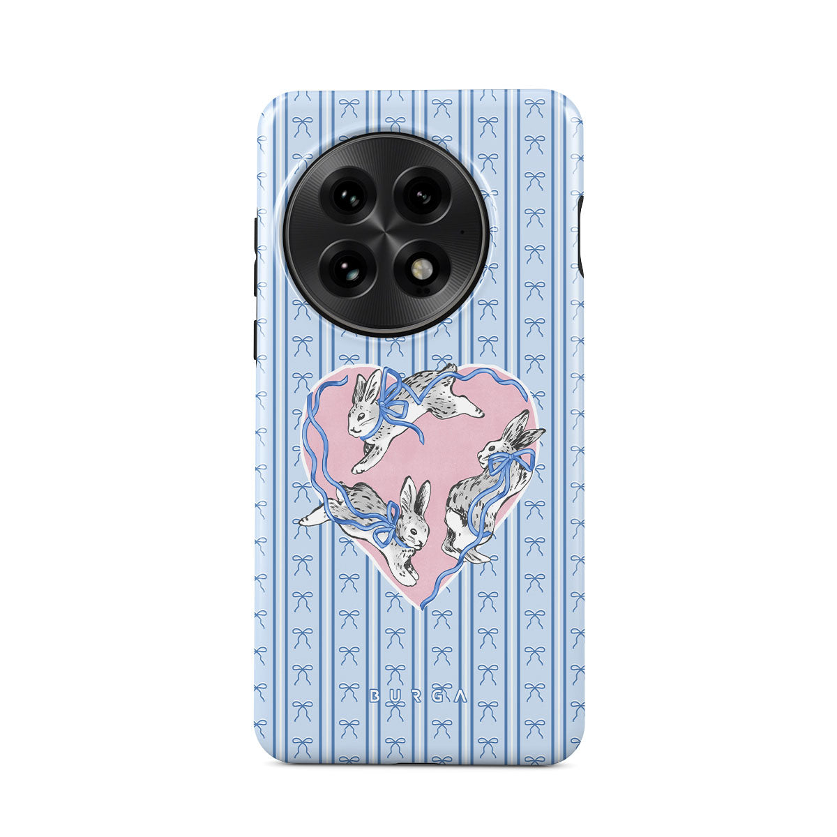 Este design contém: coelhos brancos, moldura de coração, riscas azuis