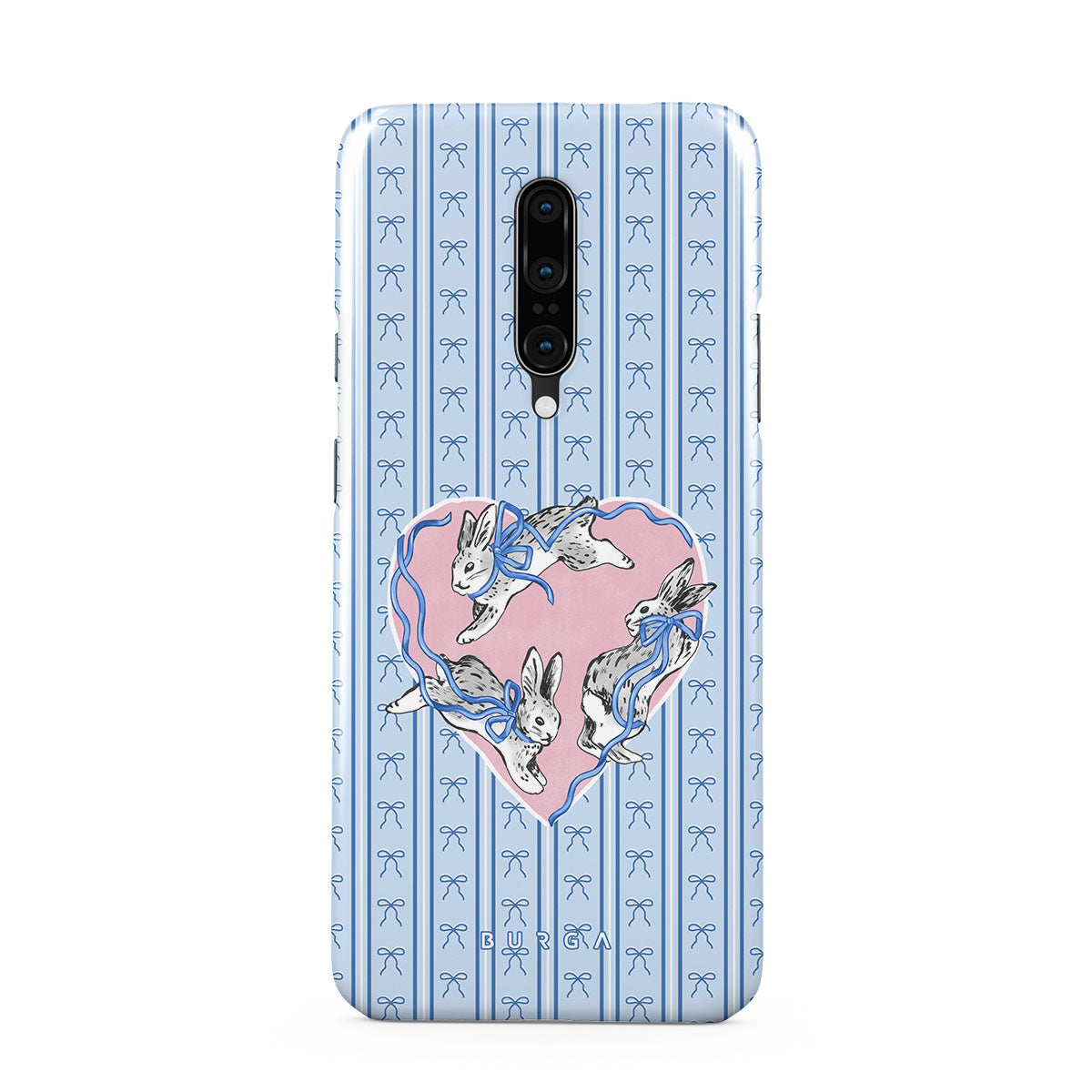 Este design contém: coelhos brancos, moldura de coração, riscas azuis