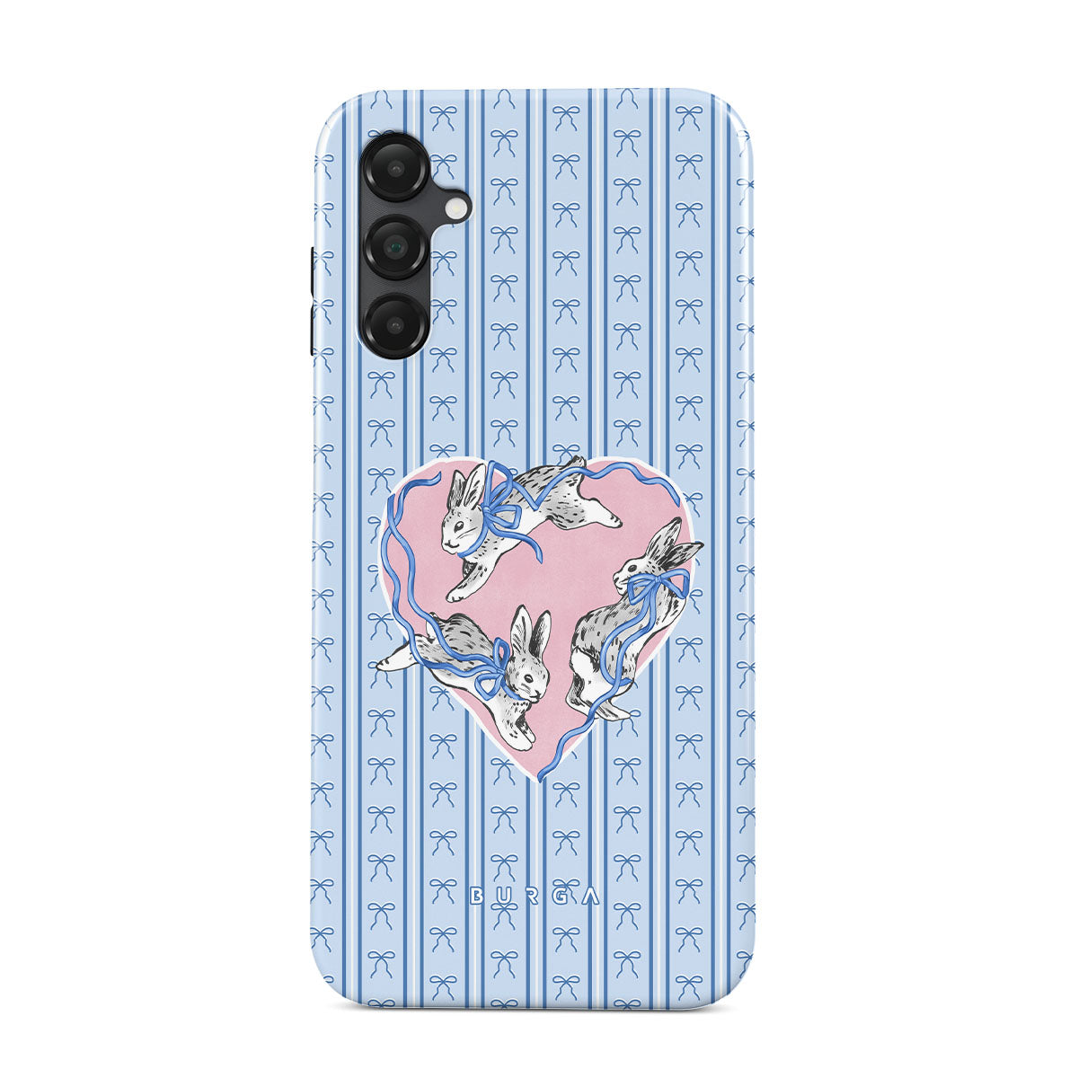 Este design contém: coelhos brancos, moldura de coração, riscas azuis
