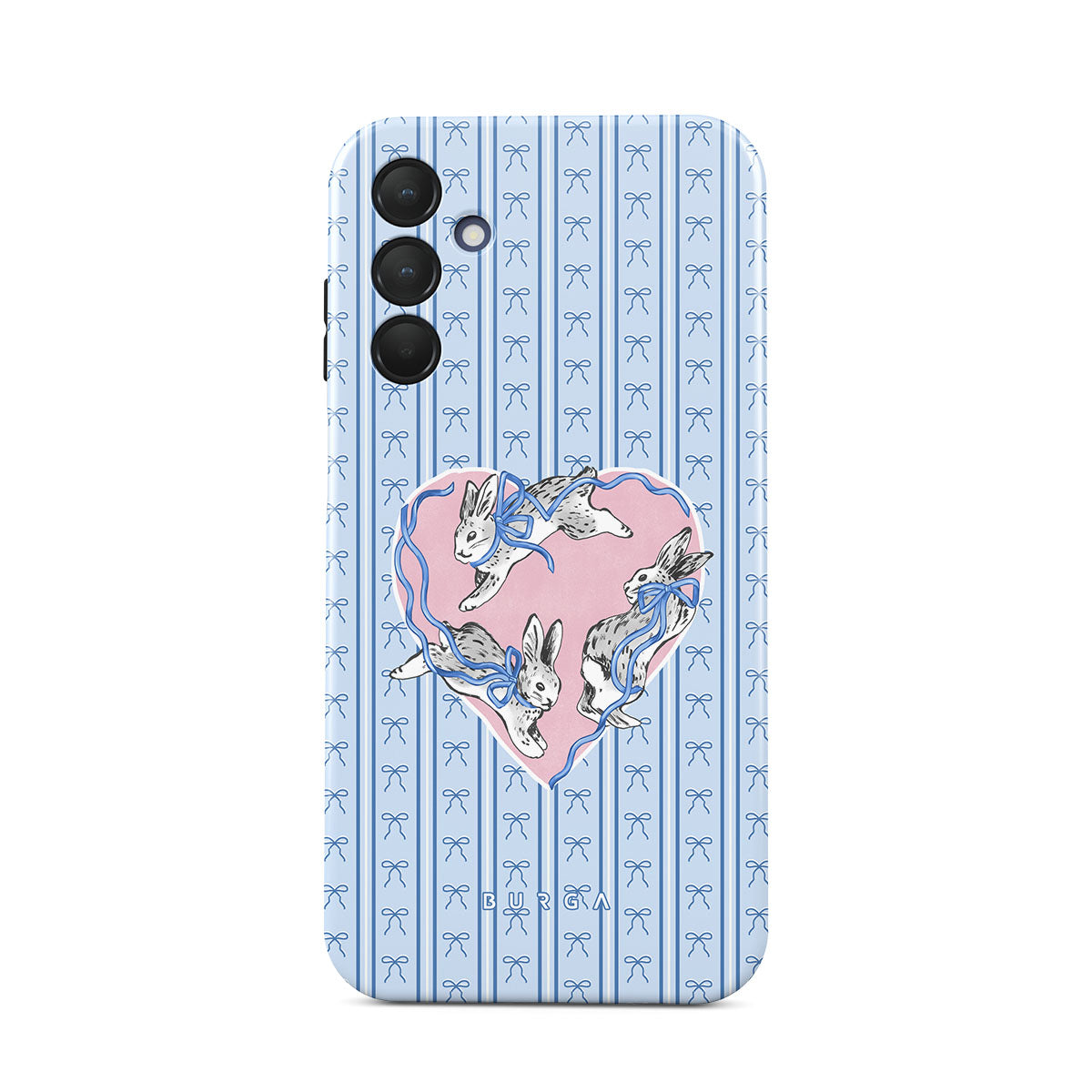 Este design contém: coelhos brancos, moldura de coração, riscas azuis