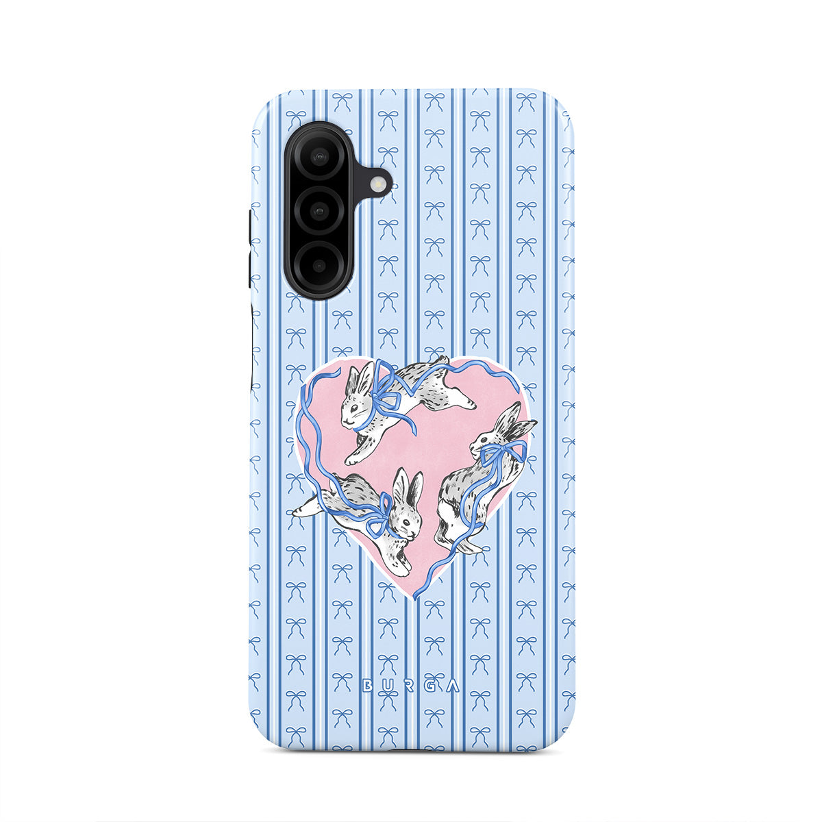 Este design contém: coelhos brancos, moldura de coração, riscas azuis