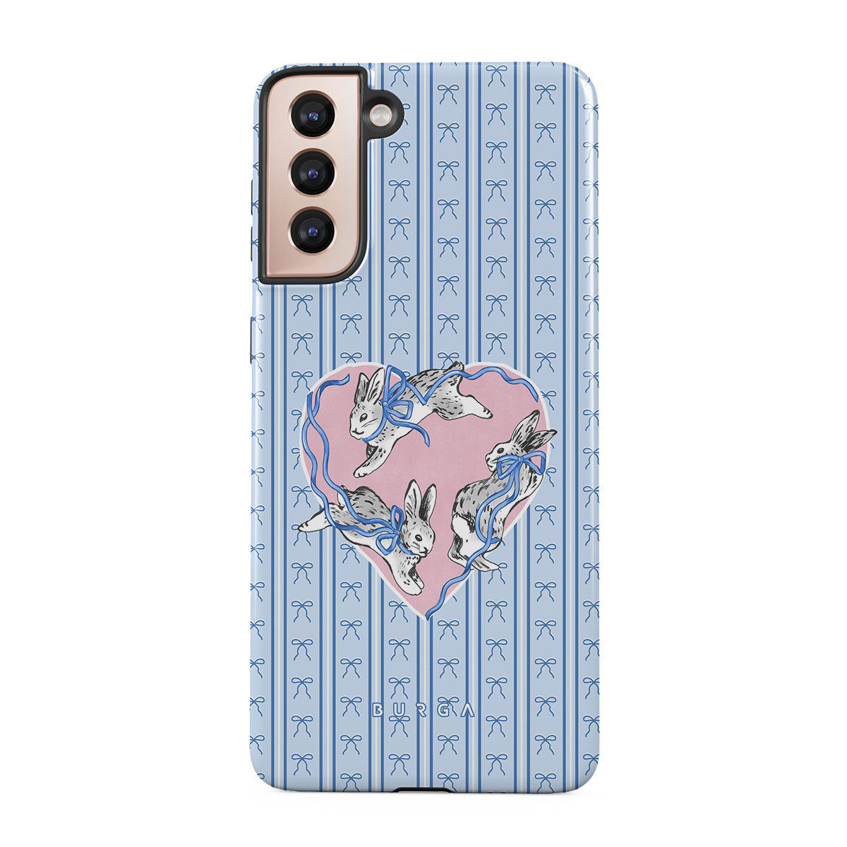Este design contém: coelhos brancos, moldura de coração, riscas azuis